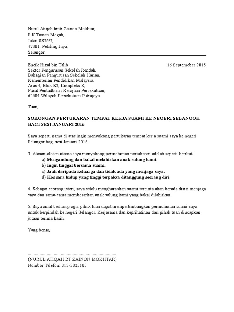 Contoh Surat Pertukaran Tempat Kerja Kerajaan Contoh Surat Rayuan Pertukaran Tempat Kerja Guru Contoh Surat Alasan Permohonan Pertukaran Tempat Kerja Unas Alif
